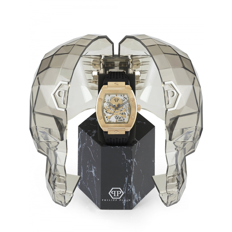 Philipp Plein men's watch from The $ keleton collection. The movement of the watch is mechanical with automatic winding. The 44 mm diameter watch case is made of gold-colored steel. The strap is made of black silicone. The dial is a skeletonized silver color. Water resistance is 5 ATM / 50 meters. Reference: PWBAA0321