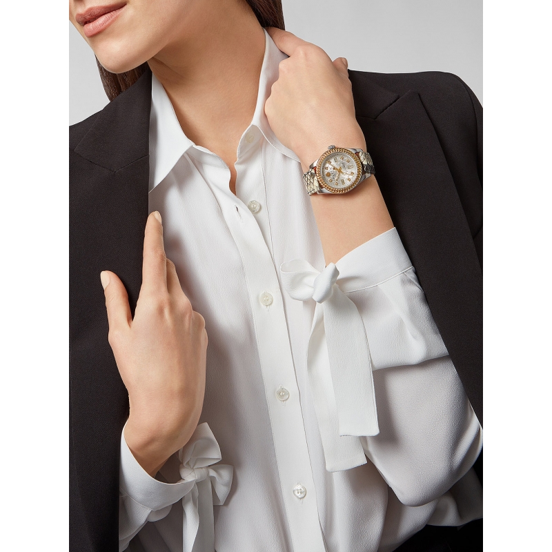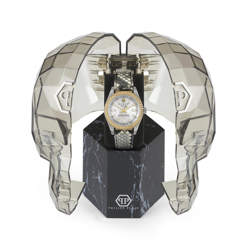 Philipp Plein ladies watch from the Queen collection. The movement of the watch is quartz. The 36 mm diameter watch case is in two-tone silver and gold steel. The strap is in green leather. The dial is silver in color. Water resistance is 5 ATM / 50 meters. Reference: PWDAA0121