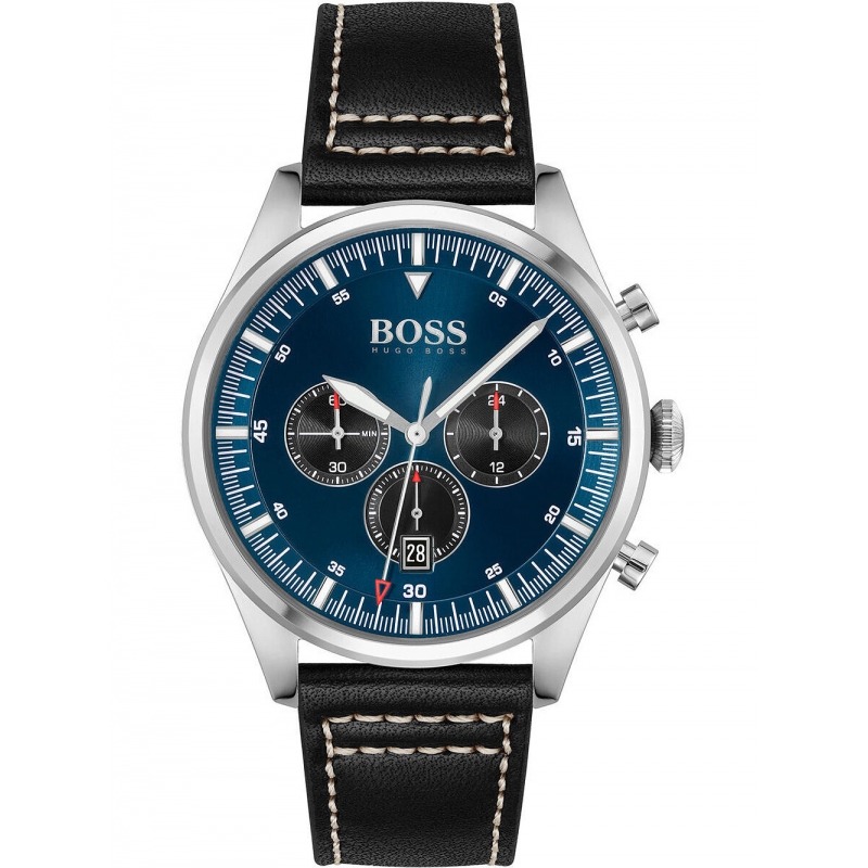 Hugo Boss men's watch from the Pioneer collection. The movement of the watch is quartz with date and chronograph functions. The watch case is made of steel, diameter 44 mm. The watch strap is made of black leather. The dial is blue. Water resistance is 5 ATM / 50 meters. Reference: 1513866