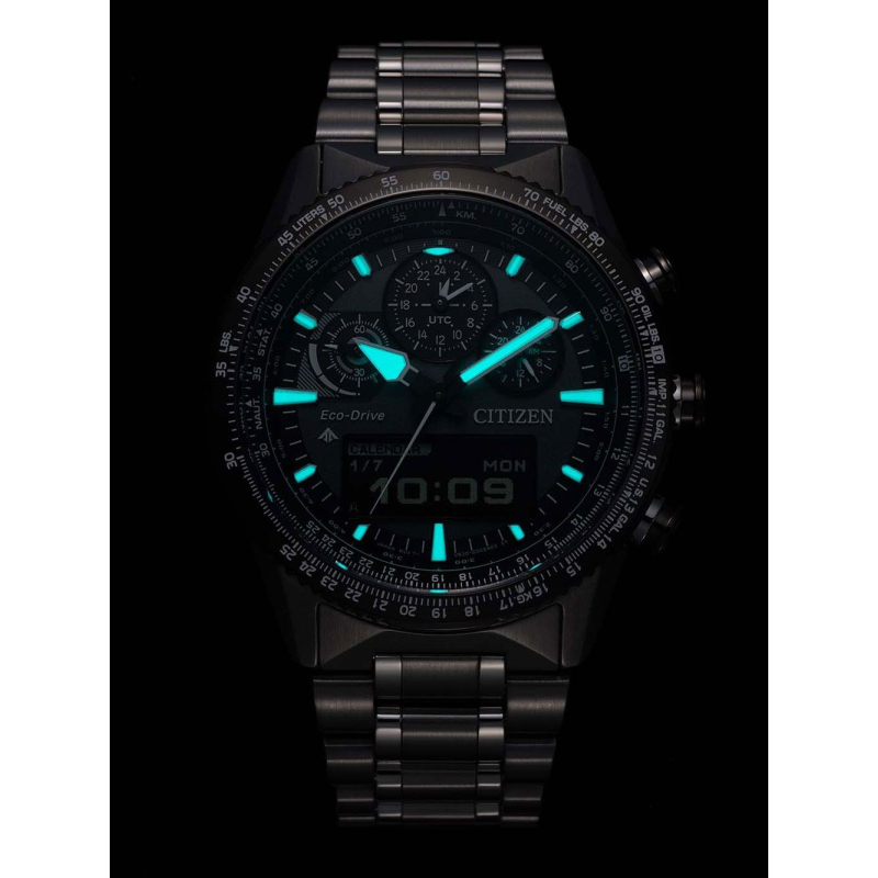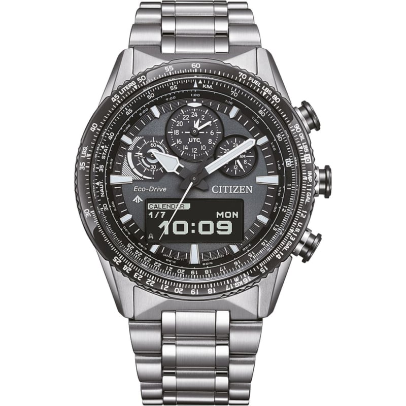 Citizen men's watch from the Promaster collection. The watch features an Ecodrive quartz movement (solar-powered). The case is made of steel, with a diameter of 43 mm. The bracelet is made of steel. The crystal is sapphire. The dial is black with a digital display. Water resistance is 20 bar / 200 meters. Reference: JV2006-55H