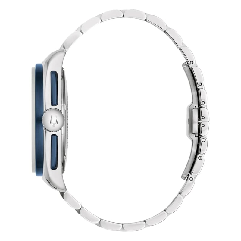 Bulova men's watch from the Lunar Pilot collection. The watch has a quartz movement with chronograph functions. The case is stainless steel, 43.5 mm in diameter. The bracelet is stainless steel. The dial is blue. Sapphire crystal. Water resistance is 5 bar / 50 meters. Reference: 98A329