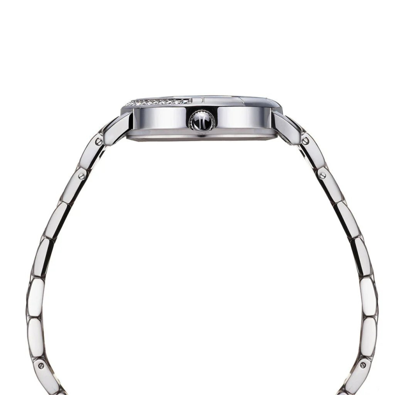 Alviero Martini 1a Classe women's watch from the Positano collection. The watch has a quartz movement. The case is made of steel, with a diameter of 30 mm. The bracelet is made of steel. The dial is blue mother-of-pearl with zirconia stones. Water resistance is 3 ATM / 30 meters. Reference: AC00340050201B02