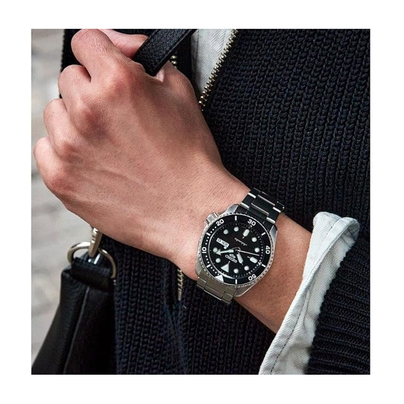 Seiko men's watch from the 5 Sports collection. The watch features a self-winding mechanical movement with date and day of the week functions. The case is made of steel, with a diameter of 42 mm. The bracelet is made of steel. The dial is black. Water resistance is 20 bar / 200 meters. Reference: SRPE99K1