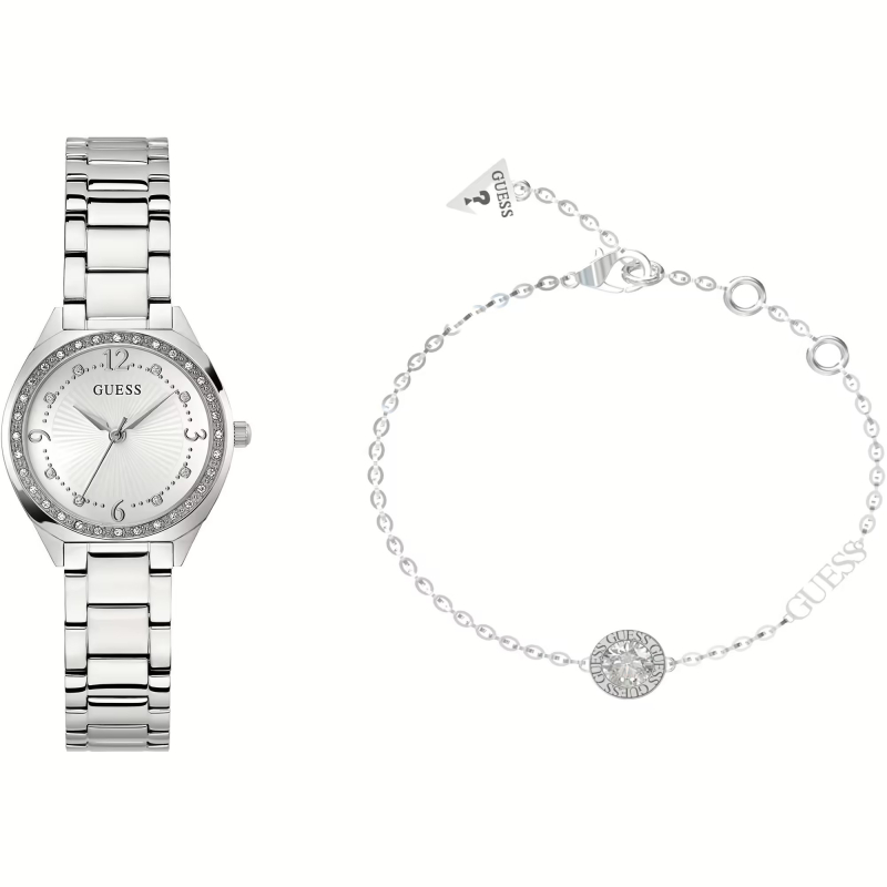 Guess women's watch and bracelet box set from the Charlotte collection. The watch has a quartz movement. The case is stainless steel, 30 mm in diameter. The bracelet is stainless steel. The dial is white. Water resistance is 3 ATM / 30 meters. Reference: JUBS05119JWRHS