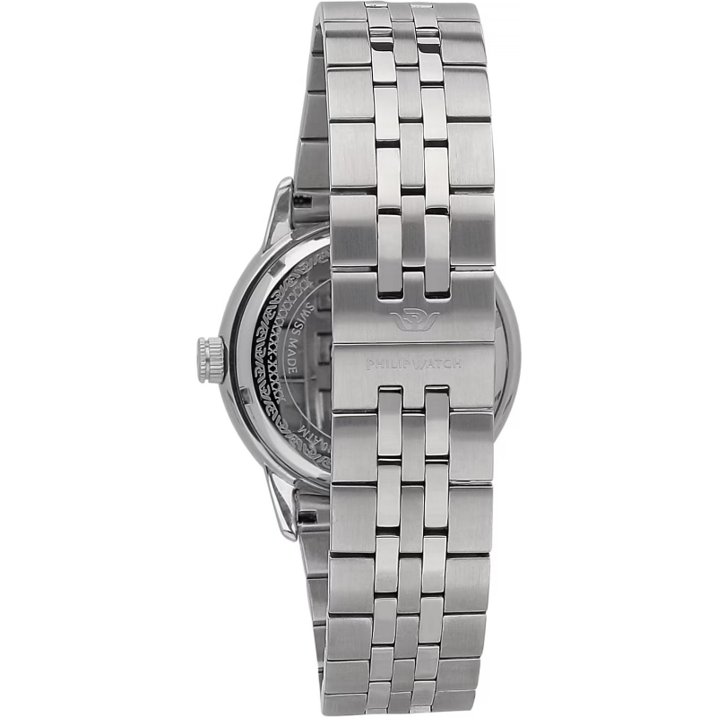 Philip Watch men's watch from the Anniversary collection. The watch features a Swiss-made quartz movement with a date display. The case is made of steel, measuring 40 mm in diameter. The bracelet is made of steel. The dial is black. Water resistance is 10 ATM / 100 meters. Reference: R8253150012