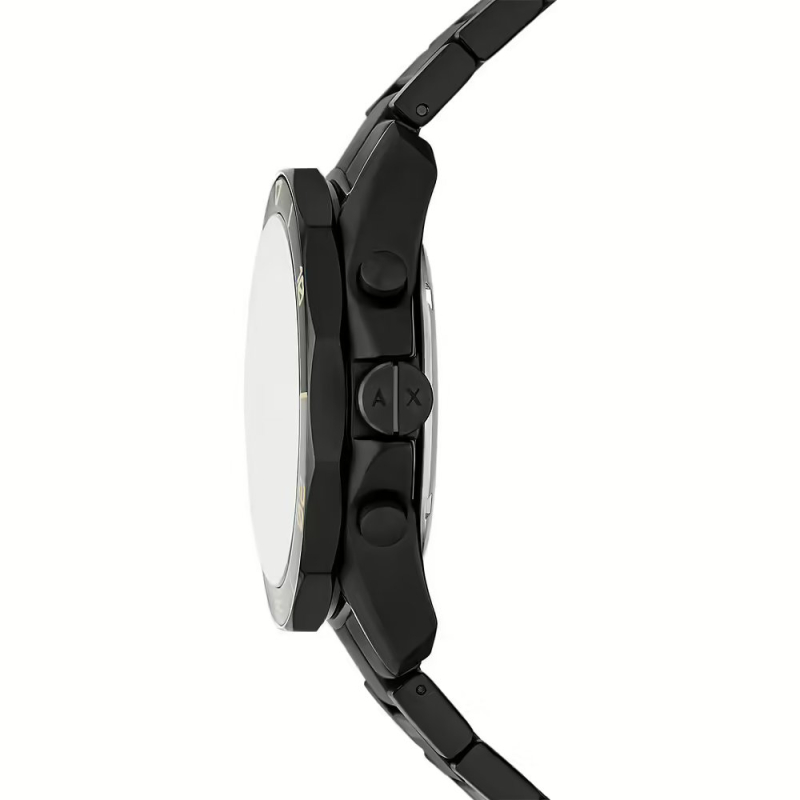 Armani Exchange men's watch from the Spencer collection. The watch has a quartz movement with date, chronograph, and 24-hour functions. The case is made of black IP steel, with a diameter of 44 mm. The bracelet is made of black IP steel. The dial is black. Water resistance is 10 ATM / 100 meters. Reference: AX1963