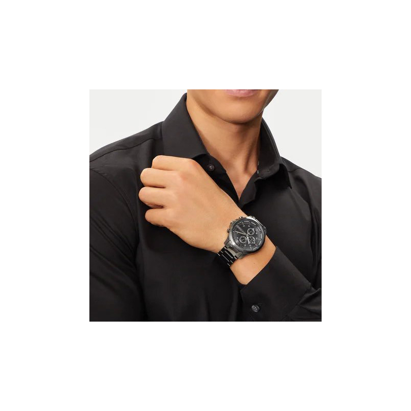 Armani Exchange men's watch from the Hampton collection. The watch has a quartz movement with chronograph functions. The case is made of gray IP steel, 46 mm in diameter. The bracelet is made of gray IP steel. The dial is black. Water resistance is 5 ATM / 50 meters. Reference: AX2454