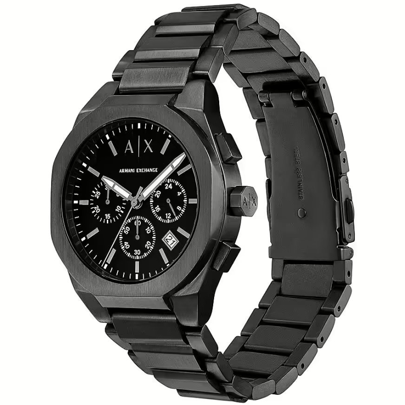 The 42mm stainless steel case with a black satin finish pairs with a black stainless steel bracelet with a folding clasp, while the black dial provides a sophisticated aesthetic that's perfect with both casual and formal outfits.