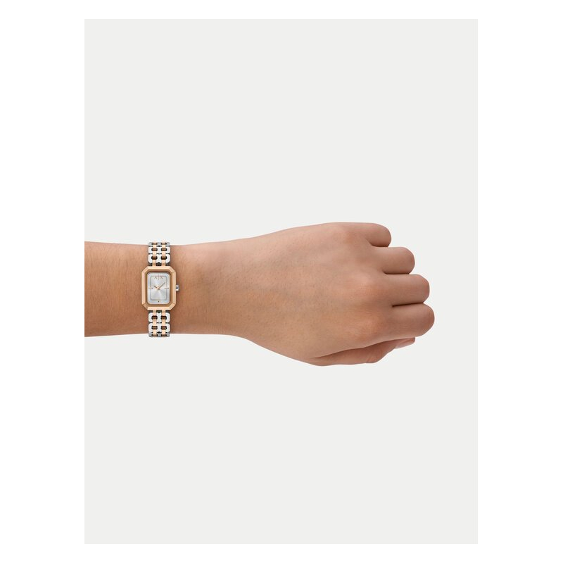 The 27 mm rectangular stainless steel case with a polished finish pairs with a two-tone (silver and rose gold) steel bracelet with a folding clasp, while the silver dial provides a bright and refined aesthetic, ideal with both casual and formal looks.