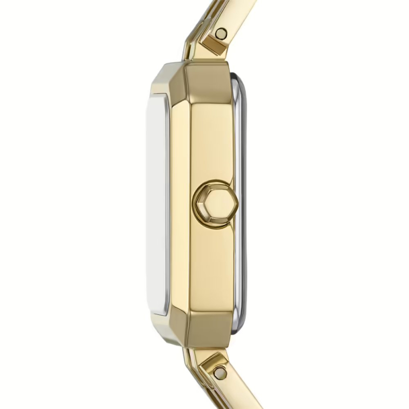 The 27mm rectangular gold-tone stainless steel case pairs with a gold-tone steel bracelet with slim links and a folding clasp, while the silver-tone sunray dial provides a luminous and refined aesthetic, ideal with casual chic or more formal looks.
