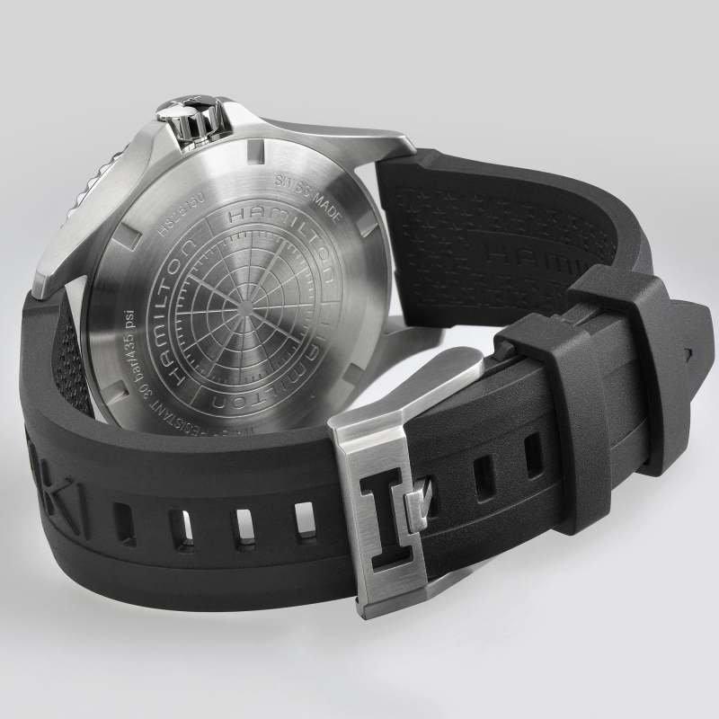 Professional diving performance and sporty marine design define the Hamilton Khaki Navy Scuba Auto H82515330 men's watch , a Swiss Made diver designed for those who love adventures at sea and uncompromising technical sporty style.