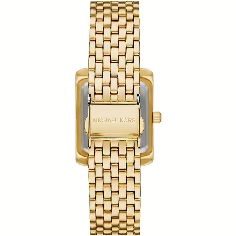 The 33 mm rectangular gold-finish stainless steel case frames a green dial with Roman numerals and stick indexes, while the sides of the case are embellished with crystals that add sparkle and sophistication. The gold-finish stainless steel bracelet with a folding clasp completes the look with elegance and comfort. ([turn0search0][turn0search10])