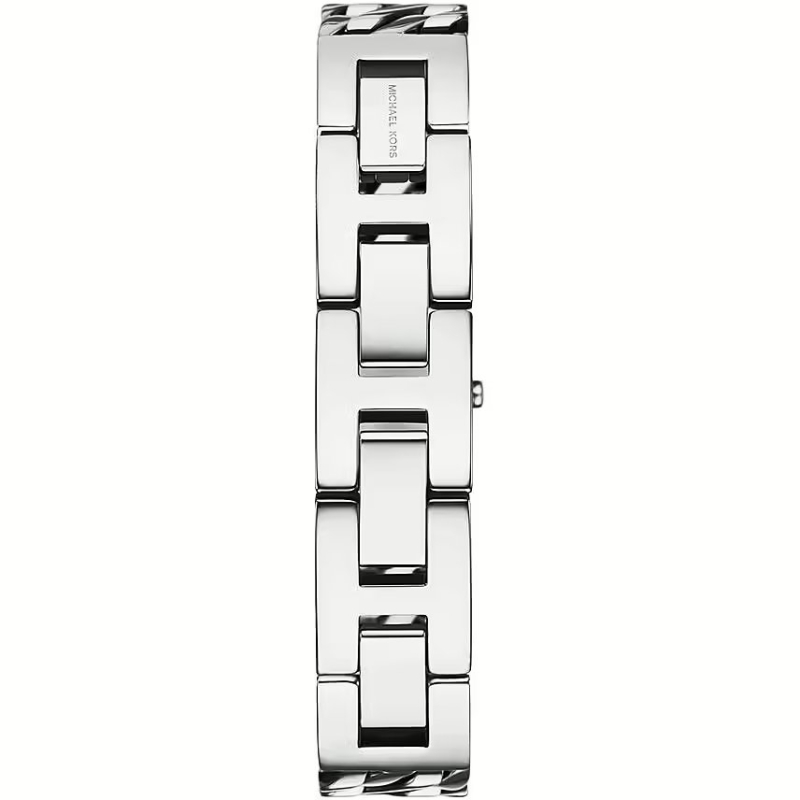 The 14mm square stainless steel case and white dial create a clean, modern aesthetic ideal for both elegant and casual outfits. The silver- tone stainless steel bracelet with integrated chain links offers a comfortable and secure fit, while the scratch-resistant mineral crystal ensures long-lasting protection.