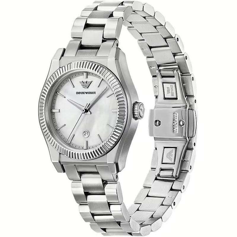 Delicate and luminous, this Emporio Armani watch embellishes the wrist with mother-of-pearl reflections and a discreet elegance, perfect for those who love a refined and feminine style.