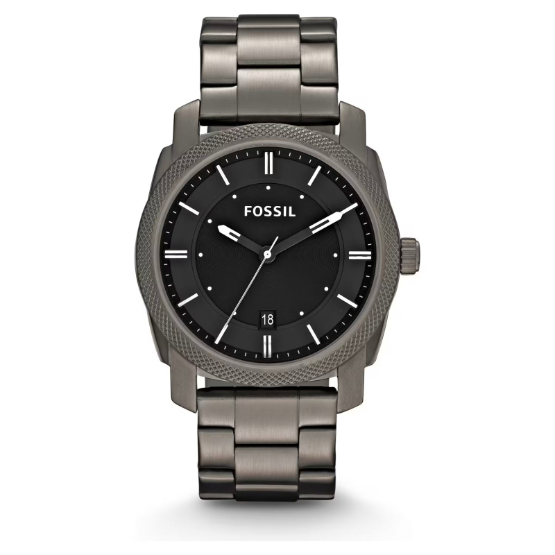 Fossil men's watch from the Machine collection. The watch has a quartz movement with a date display. The case is made of gray IP stainless steel, measuring 42 mm in diameter. The bracelet is made of gray IP stainless steel. The dial is black. Water resistance is 5 ATM / 50 meters. Reference: ES5393