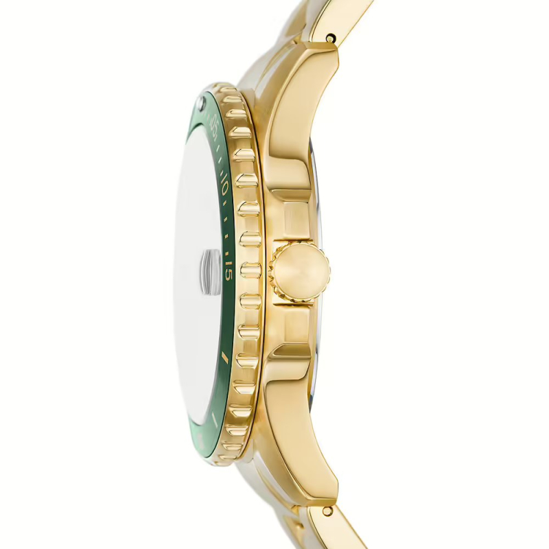 Fossil Blue Dive FS6030 : Gold PVD and a green dial for a bold and sophisticated look, perfect for both city and beach. Ideal for adventurous weekends and summer evenings, it adds character and light to even the most basic outfits.