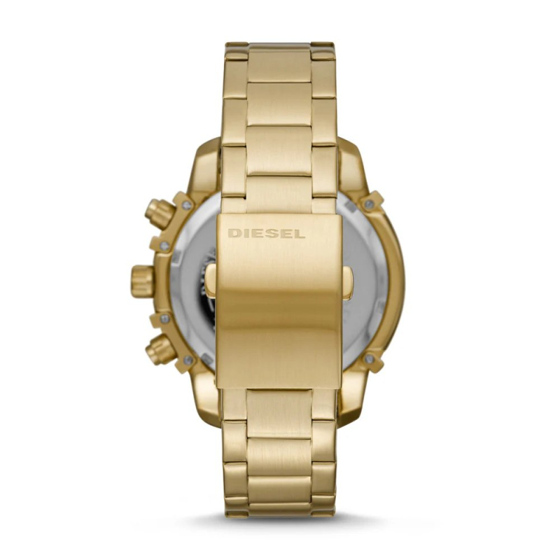 Diesel men's watch from the Griffed collection. The watch has a quartz movement with date and chronograph functions. The case is made of gold PVD steel, with a diameter of 48 mm. The bracelet is made of gold PVD steel. The dial is black. Water resistance is 5 ATM / 50 meters. Reference: DZ4522