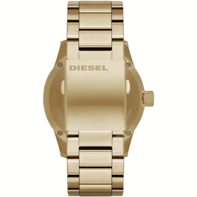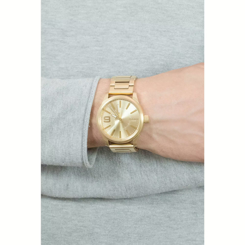 Diesel men's watch from the Rasp collection. The watch has a quartz movement. The case is made of gold PVD steel, with a diameter of 46 mm. The bracelet is made of gold PVD steel. The dial is gold. Water resistance is 5 ATM / 50 meters. Reference: DZ1761