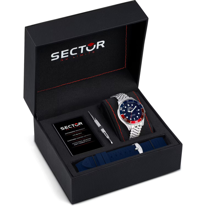 Sector 230 R3223161018 : automatic heart and blue dial for a sporty and refined style, perfect for those who appreciate details. From work to weekend, it follows you with character—with a complimentary rubber strap for an instant look change.