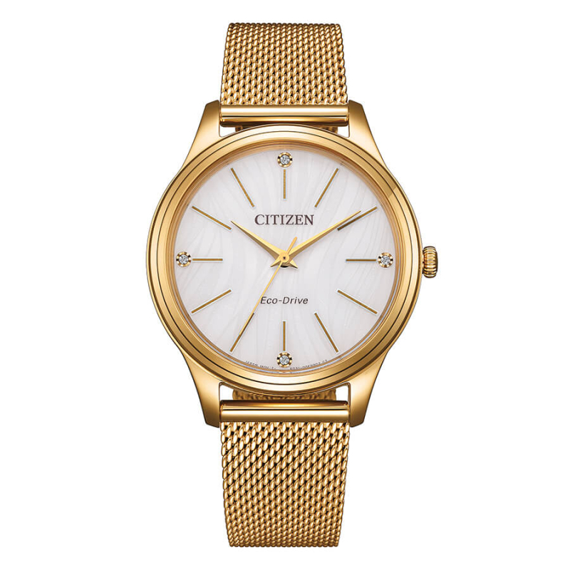 Citizen women's watch from the OF collection. The watch features an Eco-Drive quartz movement (solar-powered, 180-day power reserve) with a date display. The case is made of gold-plated PVD steel, with a diameter of 34 mm. The bracelet is made of gold-plated PVD steel. The dial is white. Water resistance is 5 bar / 50 meters. Reference: EM1222-87A