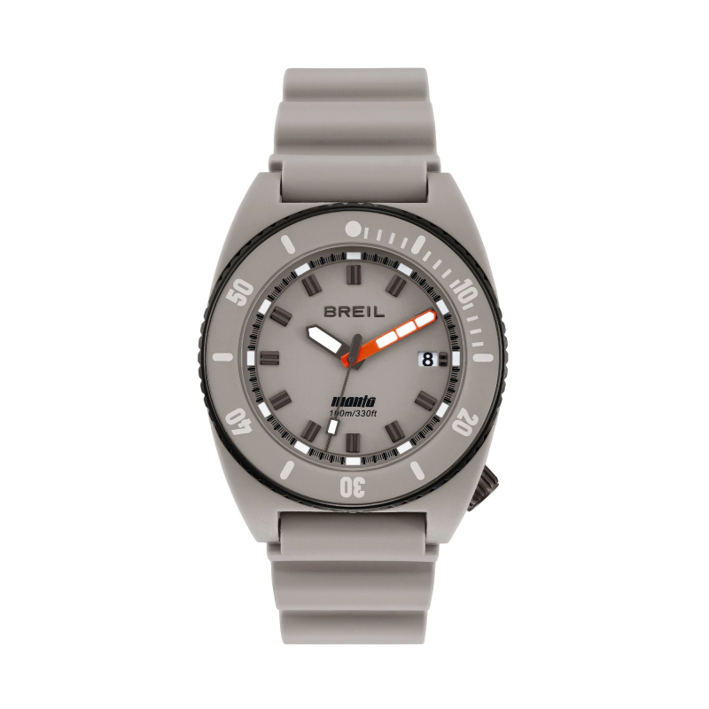 Breil men's watch from the Manta ECO Blend collection. The watch has a quartz movement with a date display. The 42 mm diameter sand-colored bioceramic case has a gray polyurethane strap. The dial is gray. Water resistance is 10 ATM / 100 meters. Reference: TW2196