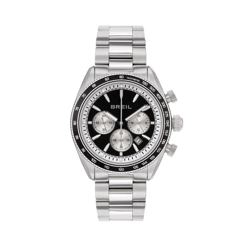 Breil men's watch from the Vanguard collection. The watch has a quartz movement with date, chronograph, and 24-hour functions. The case is steel, 43 mm in diameter. The bracelet is steel. The dial is black. Water resistance is 10 ATM / 100 meters. Reference: TW2108
