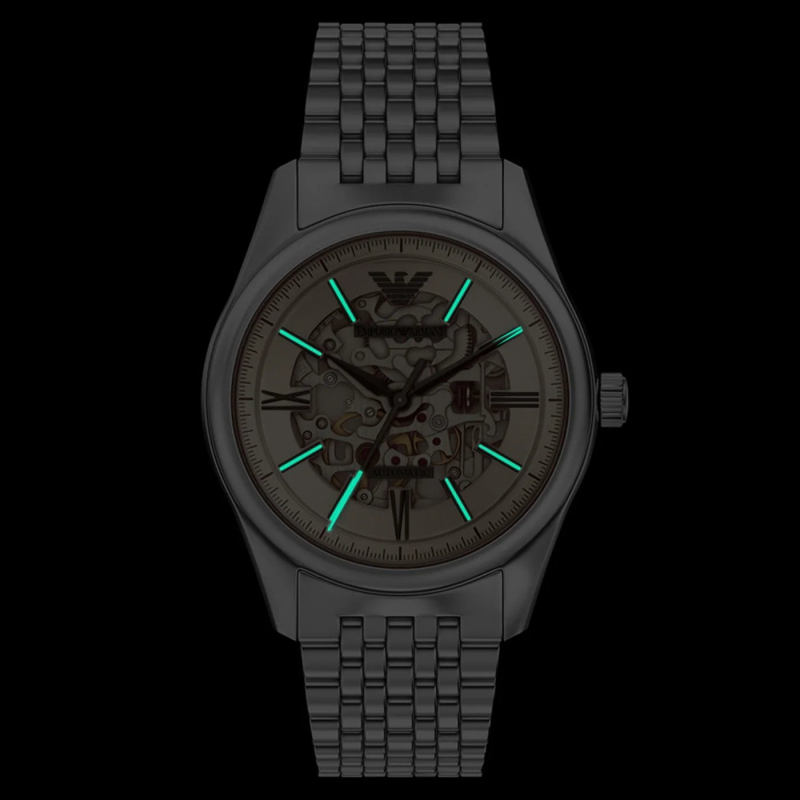 Emporio Armani AR60095 : silver skeleton dial and automatic movement for a sophisticated style that captivates at first glance. Perfect for work, events, and special evenings, it adds character and sophistication to every look.