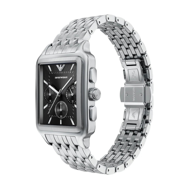 Emporio Armani AR11751 : rectangular steel case and black dial for a modern, elegant, and distinctive style. Perfect for work, events, and evenings out, it effortlessly adds character and sophistication to any look.