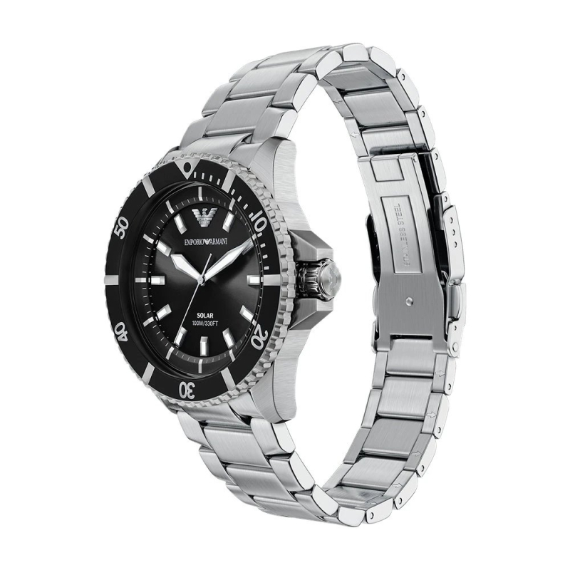 Emporio Armani men's watch. The watch has a solar-powered quartz movement. The case is made of steel, with a diameter of 42 mm. The bracelet is made of steel. The dial is black. Water resistance is 10 ATM / 100 meters. Reference: AR11787