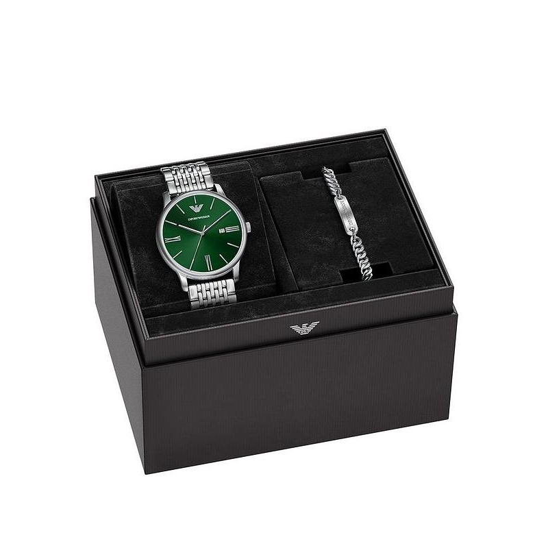 Emporio Armani AR80087SET : matching steel watch and bracelet with a green dial, for a modern and sophisticated style that stands out with elegance. Perfect as a gift or for everyday wear, it adds character and sophistication to casual and more refined looks.