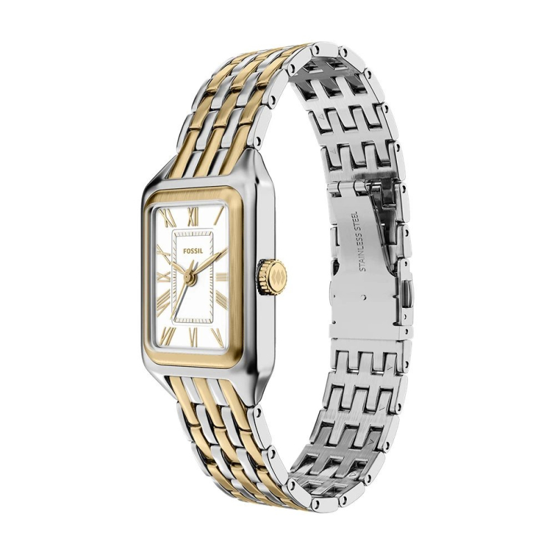 Fossil Raquel ES5468 : stainless steel and gold PVD with a white dial for a luminous and delicate elegance, perfect from morning to night. Refined and feminine on the wrist, it stylishly complements everyday looks, the office, and special occasions.