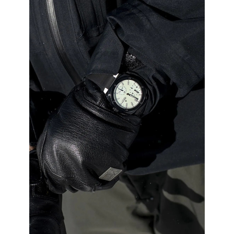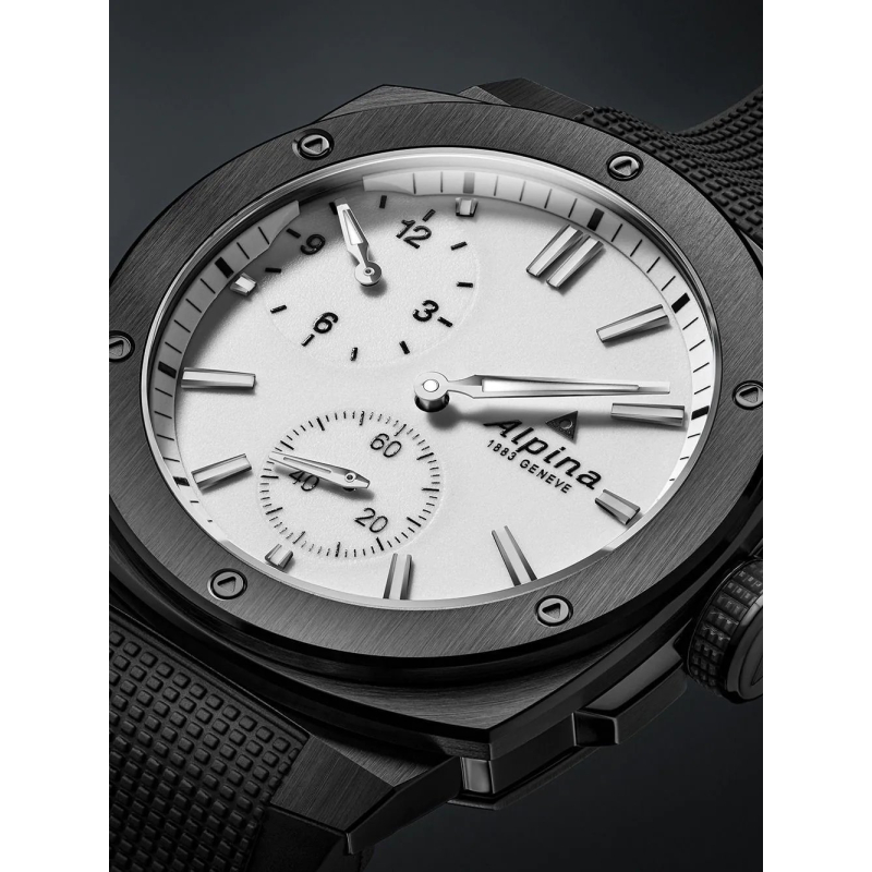Alpina men's watch from the Alpiner collection. The watch features a self-winding mechanical movement (AL-650 caliber, 38 hours of power reserve, frequency of 28,800 vph). The case is made of black IP steel, 41 mm in diameter. The strap is black rubber. The dial is white. Water resistance is 20 ATM / 200 meters. Reference: AL-650LGLBL4AEBDLC