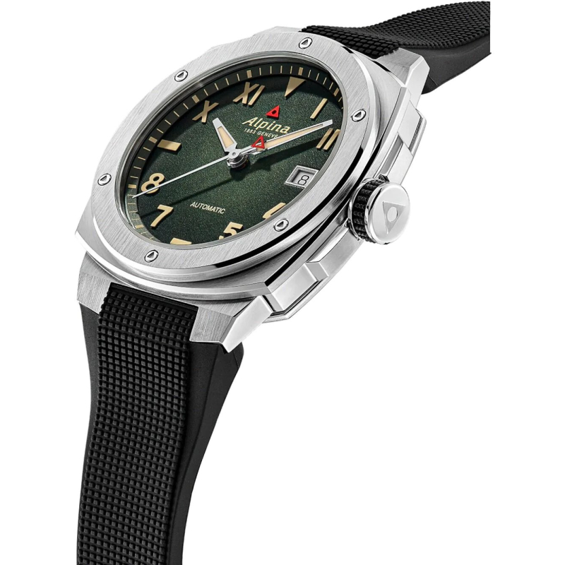 Alpina men's watch from the Alpiner collection. The watch features a self-winding mechanical movement (caliber AL-525, 38-hour power reserve, frequency 28,800 vph) with a date display. The case is steel, diameter 39 mm. The strap is black rubber. The dial is green. Water resistance is 20 ATM / 200 meters. Reference: AL-525GRG3AE6