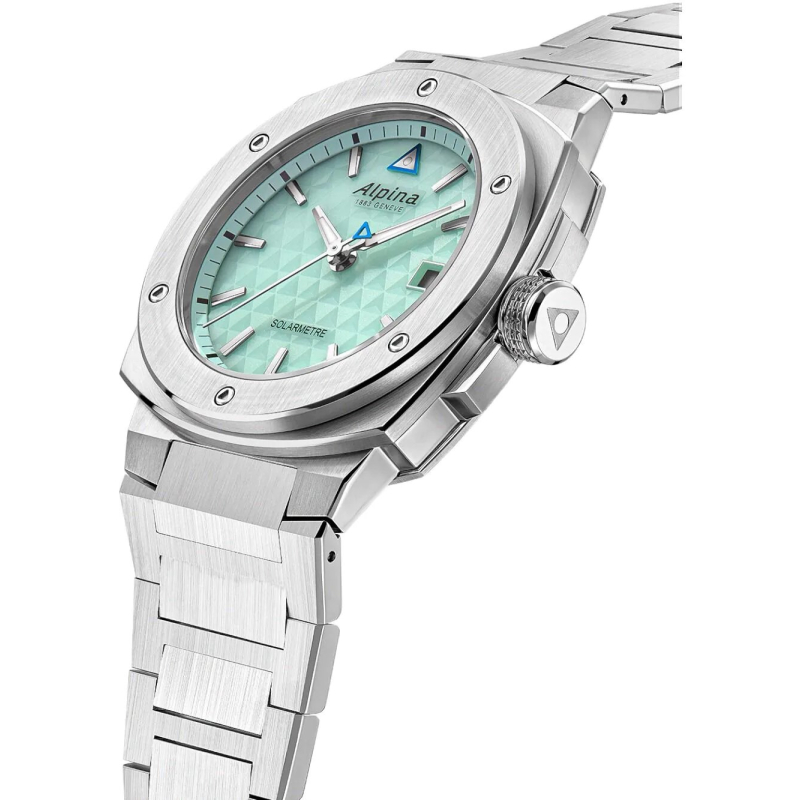 Alpina men's watch from the Alpiner collection. The watch features a solar-powered quartz movement with a date display. The case is made of steel, measuring 38 mm in diameter. The bracelet is made of steel. The dial is light green. Water resistance is 10 ATM / 100 meters. Reference: AL-140LGR3AE6B