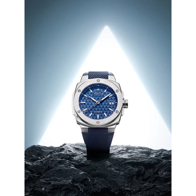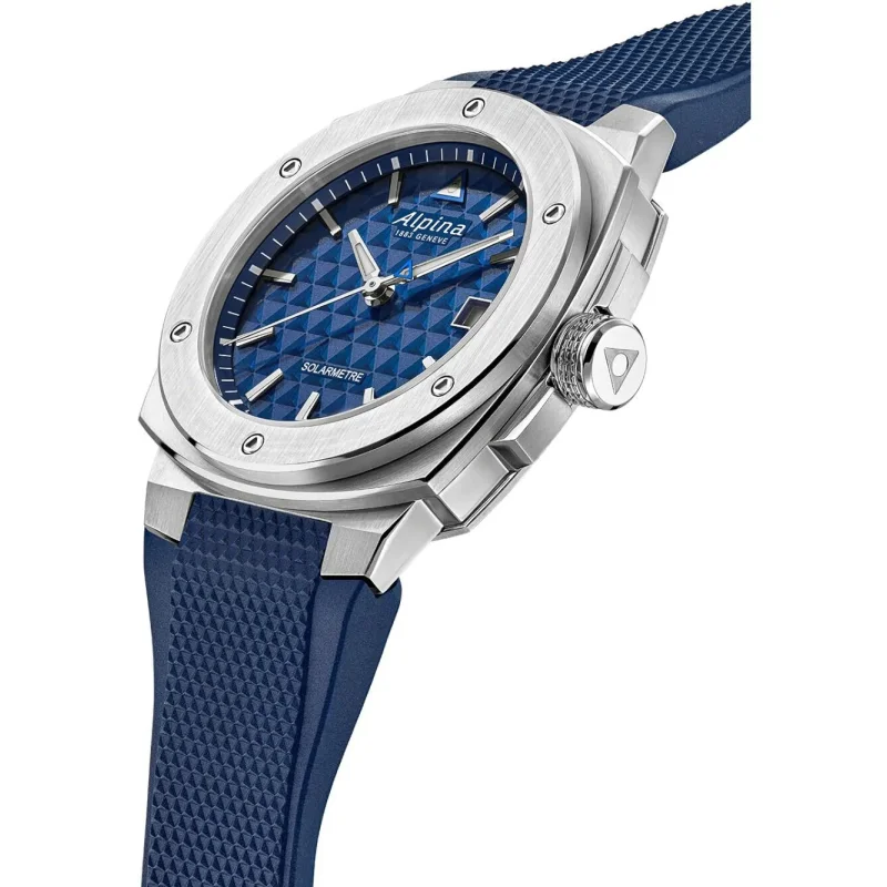 Alpina men's watch from the Alpiner collection. The watch features a solar-powered quartz movement with a date display. The case is made of steel, with a diameter of 38 mm. The strap is blue rubber. The dial is blue. Water resistance is 10 ATM / 100 meters. Reference: AL-140N3AE6