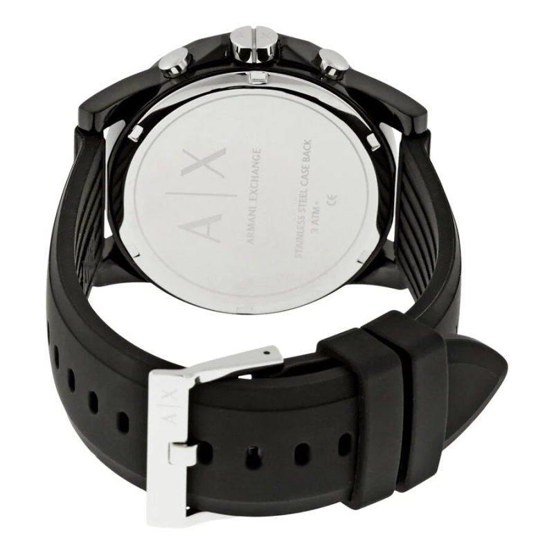 Armani Exchange men's watch from the Outerbanks collection. The watch has a quartz movement with date, chronograph, and 24-hour functions. The case is made of steel with a black nylon coating and measures 44 mm in diameter. The strap is black silicone. The dial is black. Water resistance is 3 bar / 30 meters. Reference: AX1326