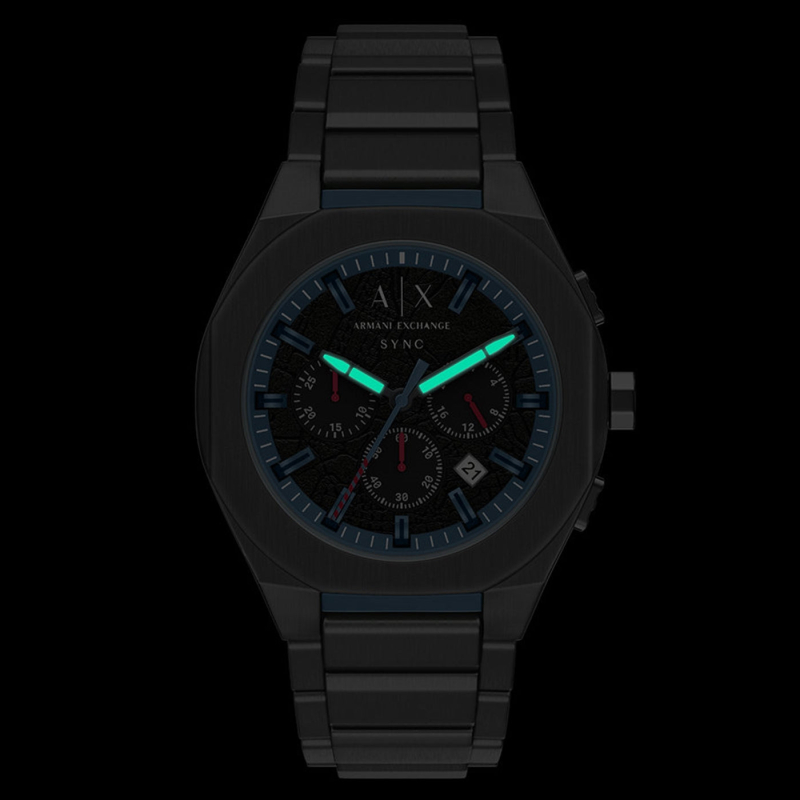 Armani Exchange men's watch from the Sync collection. The watch has a quartz movement with date, chronograph, and 24-hour functions. The case is IP gun steel, 44 mm in diameter. The bracelet is IP gun steel. The dial is black. Water resistance is 5 bar / 50 meters. Reference: AX4295