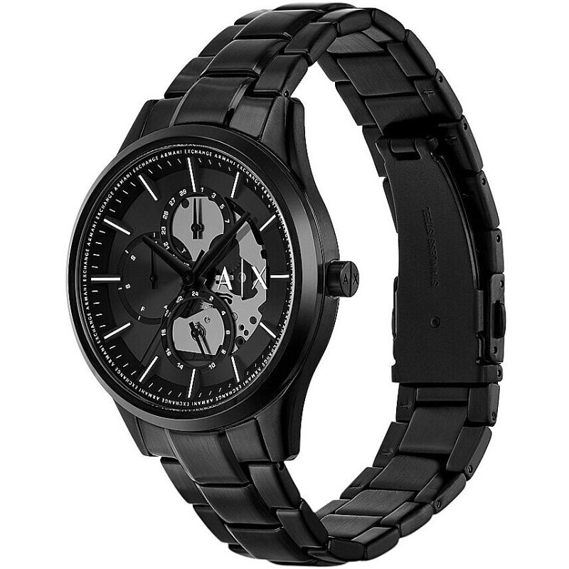 Armani Exchange men's watch and necklace set in black IP steel from the Dante collection. The watch has a quartz movement with date display, day of the week display, and 24-hour display. The case is black IP steel, 42 mm in diameter. The bracelet is black IP steel. The dial is black. Water resistance is 5 ATM / 50 meters. Reference: AX7160SET