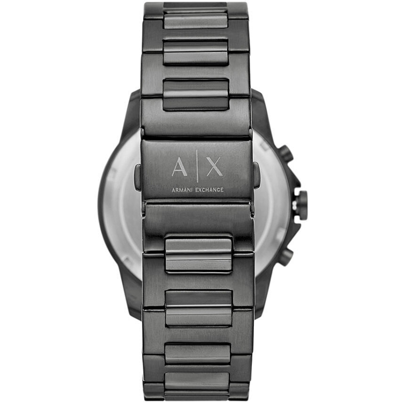 Armani Exchange men's watch and gunmetal IP steel bracelet set from the Banks collection. The watch has a quartz movement with date, chronograph, and 24-hour functions. The case is gray IP steel, 44 mm in diameter. The bracelet is gray IP steel. The dial is gray. Water resistance is 5 ATM / 50 meters. Reference: AX7170SET