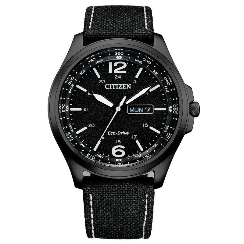 Citizen men's watch from the Military collection. The movement of the watch is quartz Eco drive with date functions and day of the week indication. The 44 mm diameter case is made of steel. The strap is made of black technical fabric. The dial is black with a lunar surface texture. Water resistance is 10 atm / 100 meters. Reference: AW0115-11E