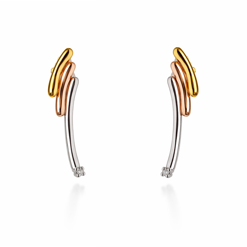 Women's earrings in 750 (18KT) white, yellow, and rose gold. Drop earrings with two natural diamonds, total carat weight 0.02 ct, G color, VS clarity. Length 2.30 cm, butterfly screw closure. Reference: GL102404