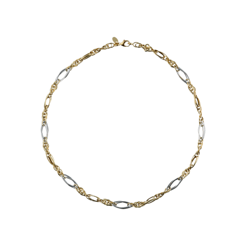 This splendid necklace in 18 KT white and yellow gold , with a patterned link , is the emblem of contemporary elegance. An intertwining of lights and reflections that gives character to every outfit, perfect to wear alone or to combine with other jewels for a unique effect. Ideal for those who love to stand out with class and refinement.