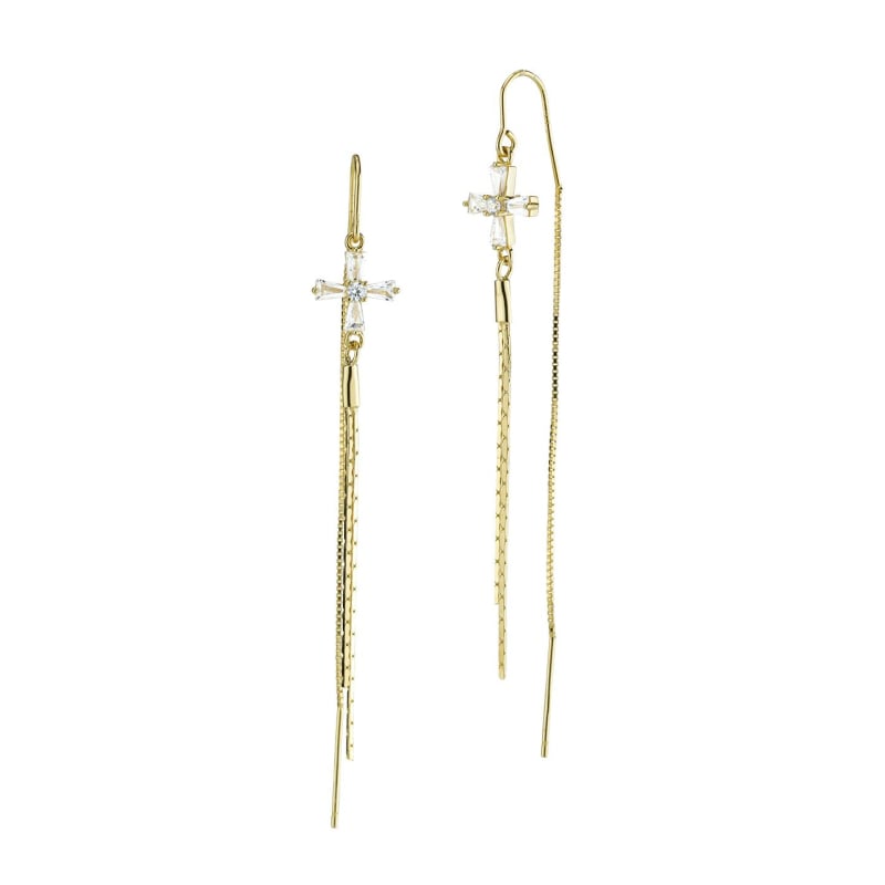 Orecchini da donna Boccadamo della collezione Sophie. Orecchini pendenti a scorrimento in argento 925 PVD oro con croci con pietre zirconi, lunghezza 5 cm. Referenza: OR909D