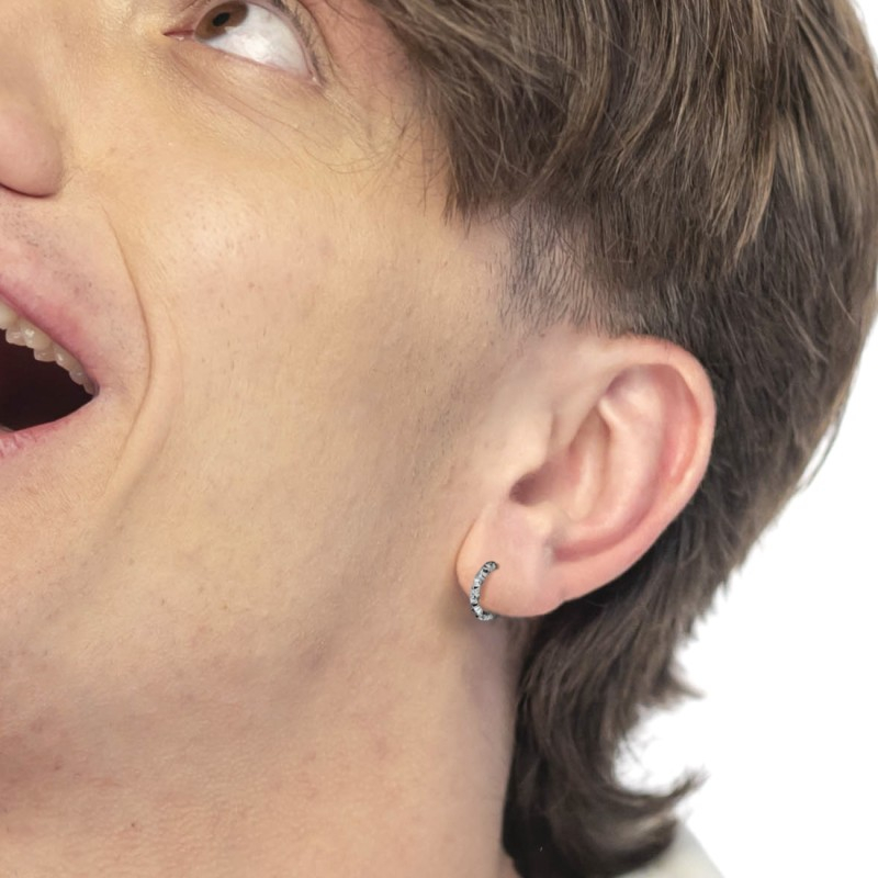 Mono orecchino in acciaio a cerchio ritorto con trama diamantata, diametro 1,5 cm, chiusura a pressione. Referenza: 33OR0122