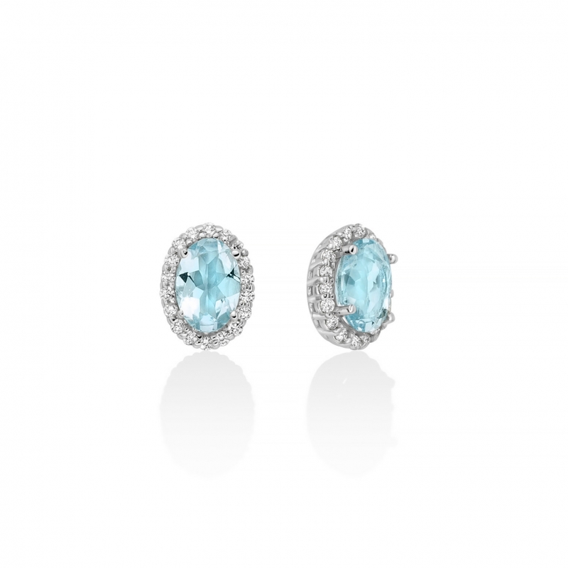 Orecchini in oro bianco e acquemarine ovali incorniciate da luminosi diamanti taglio brillante.