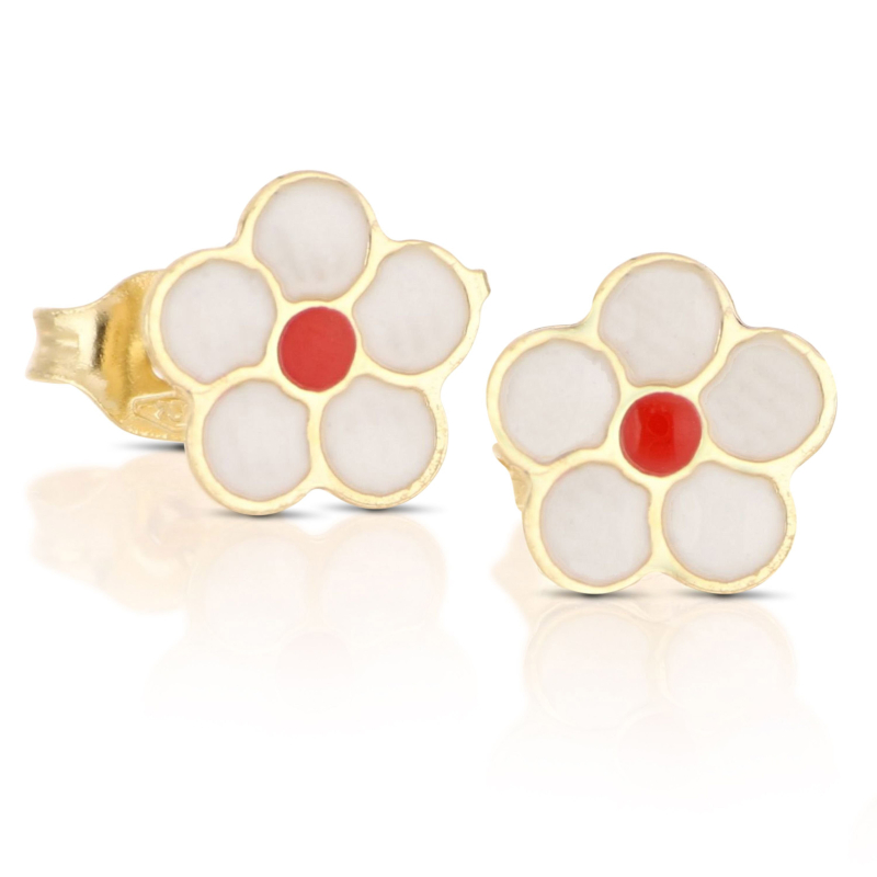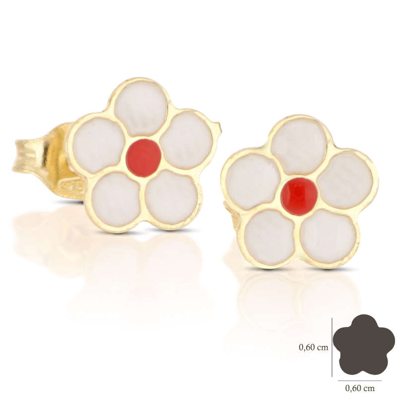 Orecchini da donna in oro giallo 375 (9 KT). Orecchini a forma di fiore con smalto, dimensioni 0,60 x 0,60 cm, chiusura con vite farfallina. Il peso degli orecchini è di 0,40 grammi. Referenza: GL102325