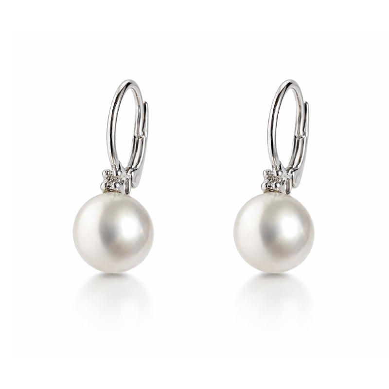 Orecchini da donna in oro bianco 750 (18 KT). Orecchini con perle e diamanti naturali, diametro perle 6,5/7 mm, caratura totale diamanti 0,02 ct. Lunghezza 1,80 cm, chiusura a monachella. Referenza: GL102410