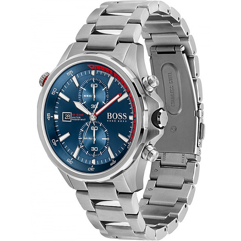 Orologio da uomo Hugo Boss della collezione Globetrotter. Il movimento dell'orologio è al quarzo con funzioni datario e cronografo. La cassa dell'orologio è realizzata in acciaio, diametro 46 mm. Il bracciale dell'orologio è realizzato in acciaio. Il quadrante è di colore blu. La resistenza all'acqua è di 10 ATM / 100 metri. Referenza: 1513823
