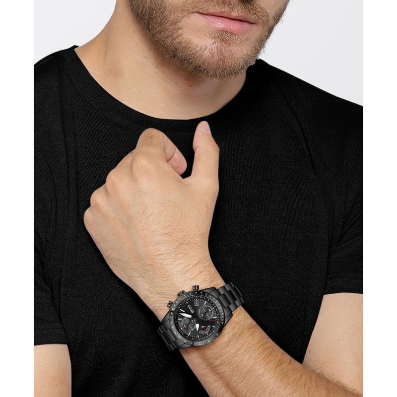 Orologio da uomo Hugo Boss della collezione Pilot Edition. Il movimento dell'orologio è al quarzo con funzioni datario e cronografo. La cassa dell'orologio è realizzata in acciaio di colore nero, diametro 44 mm. Il bracciale dell'orologio è realizzato in acciaio di colore nero. Il quadrante è di colore nero. La resistenza all'acqua è di 5 ATM / 50 metri. Referenza: 1513854