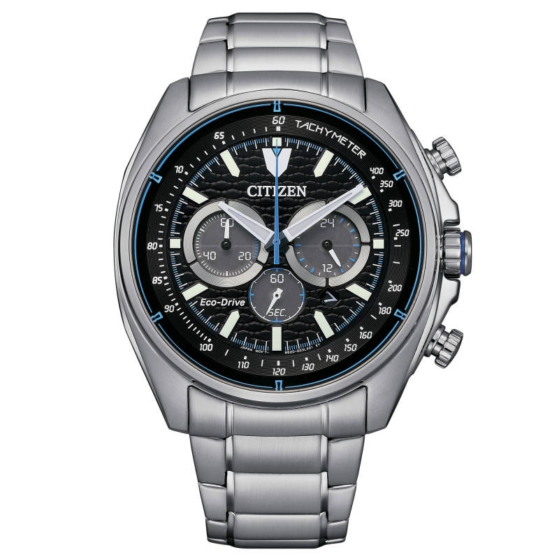 Orologio Citizen da uomo della collezione OF Crono Active. Il movimento dell'orologio è al quarzo Ecodrive con funzioni datario, cronografo, indicazione delle 24h giornaliere. La cassa dell'orologio è realizzata in acciaio, diametro 44 mm. Il bracciale dell'orologio è realizzato in acciaio. Il quadrante è di colore nero. La resistenza all'acqua è di 10 atm / 100 metri. Referenza : CA4560-81E